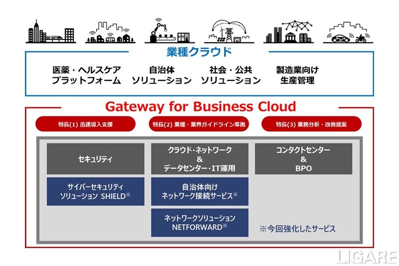 今回の取り組みは、株式会社インターネットイニシアティブ(以下、IIJ)との協業により、IIJのサービスを活用することで実施する。強化したのは、「自治体向けネットワーク接続サービス」、「サイバーセキュリティソリューションSHIELD」、「ネットワークソリューション NETFORWARD」の3つだ。