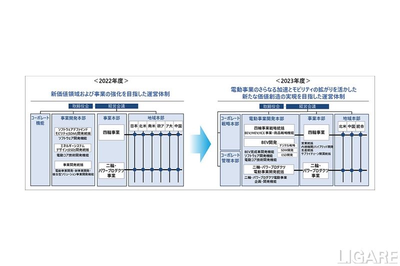 今回の運営体制変更の目的は、移動と暮らしの領域で「すべての人に生活の可能性が拡がる喜びを提供する」というビジョンを達成するためだ。電動事業開発本部は、電動事業の強化に向けて2022年に発足した事業開発本部をベースとしたものだ。この本部に、四輪事業に関わる事業戦略機能とBEVの商品開発機能、ならびに二輪・パワープロダクツ事業に関わる電動領域の戦略および開発機能を集約し、電動事業のさらなる強化、加速を図る。