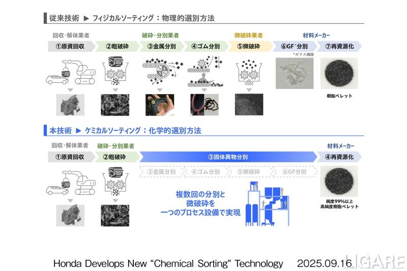 ホンダは9月16日、グループ会社の本田技術研究所が自動車廃材特有の固体異物を含有したELV※由来の廃プラスチック部品から、資源となるプラスチックを選別して抽出する、固体異物分離技術「ケミカルソーティング」の開発を発表した。