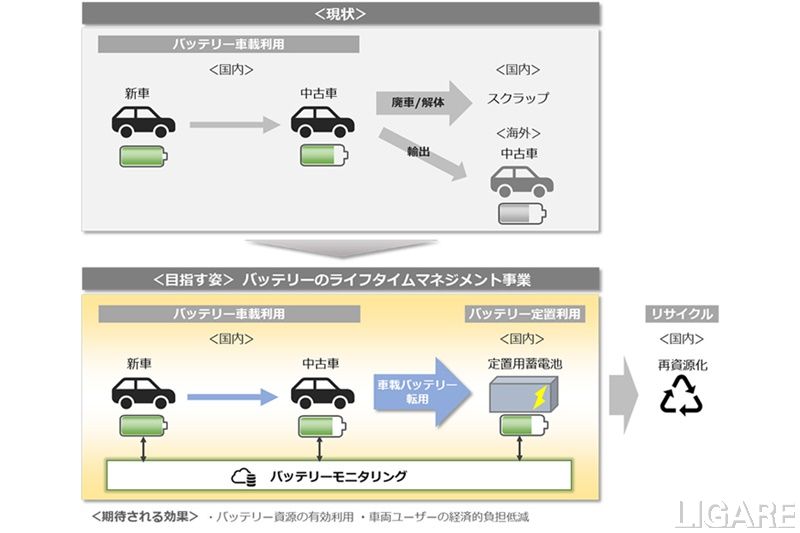 両社は、今回の覚書に基づき、「バッテリーのライフタイムマネジメント事業」と「スマート充電※1・V2G※2を通じたエネルギーマネジメント事業」について協議していくという。「バッテリーのライフタイムマネジメント事業」では、ホンダが2024年より順次発売予定の軽EVに搭載されるバッテリーを対象に、バッテリーモニタリング機能を高度化する。そして、車載用から定置用への転用を通じて、ライフタイムマネジメントを行うバッテリー価値最大化を図るとのことだ。