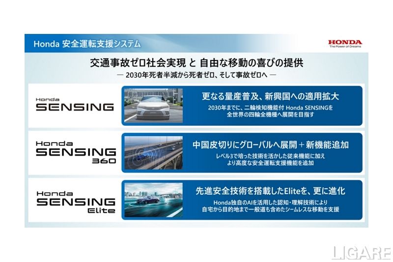 なお、同社は、2030年までに全世界において二輪検知機能付「Honda SENSING」の四輪車全機種への適用を目指す。くわえて、先進国にて「Honda SENSING 360」を2030年までに四輪車全機種へ適用し、さらに機能の進化を続ける。そして、2030年に全世界で、ホンダの二輪車、四輪車が関与する交通事故死者半減を目指すと述べている。