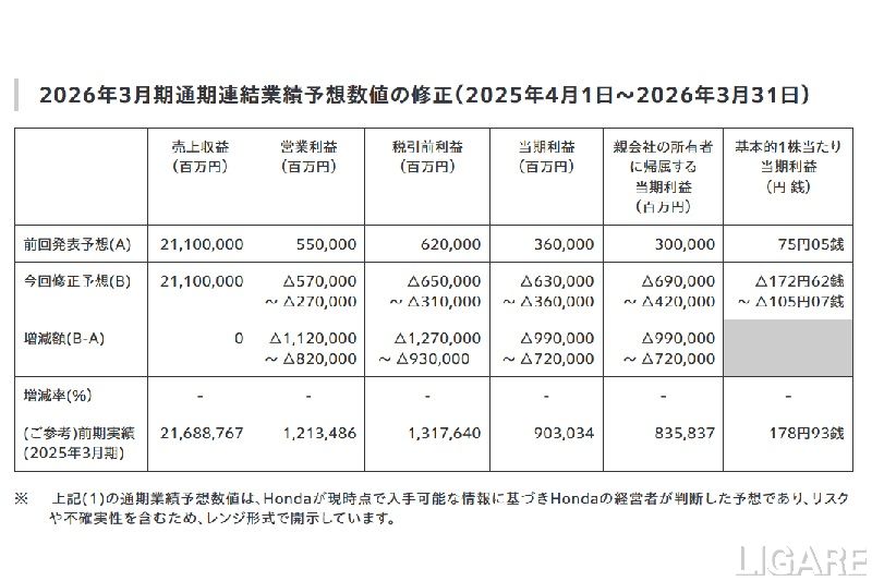 本田技研工業株式会社(以下、Honda)は、事業環境の急激な変化を踏まえた四輪電動化戦略の見直しを発表した。北米で生産予定だったEV(電気自動車)3車種の開発および発売を中止するとともに、巨額の損失発生に伴い、2026年3月期の通期連結業績予想を大幅な赤字へと下方修正した。