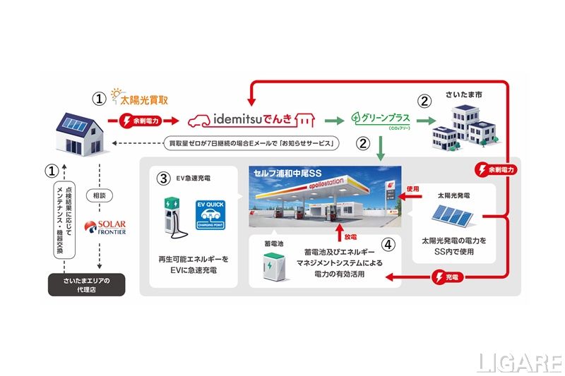 さらに、両者は、買い取った太陽光の余剰電力を、idemitsuでんきの再生可能エネルギー電力「グリーンプラス(CO2フリー)」として、さいたま市の公共施設や、出光興産系列のサービスステーション(以下、SS)であるセルフ浦和中尾SSに供給中だ。また、セルフ浦和中尾SSでは、7月にEV急速充電サービスの提供を開始した。ユーザーがEVに充電する電力も再生可能エネルギーとなっているという。