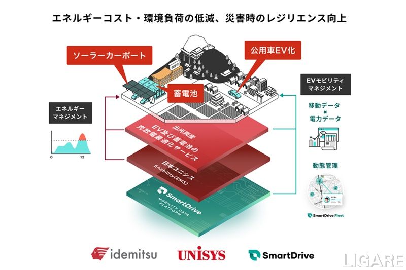 エネルギーマネジメントシステムは、出光興産と日本ユニシスが2021年3月から開始する実証実験のシステムを活用する。さらに、スマートドライブの「SmartDrive Fleet」および「Mobility Data Platform」を通じて公用車の車両データを収集・分析・活用することでEV稼働状態予測の精度を高め、最適な充放電計画の作成に取り組む。