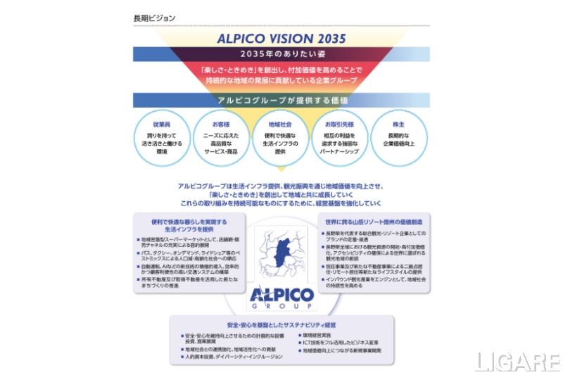 今村氏:アルピコホールディングスでは、人口減少やビジネスを取り巻く環境の変化を受けて、事業を持続させるにはDXに取り組まないといけないと考え、2024年に、2035年までの長期ビジョン「ALPICO VISION 2035」を作成しました。その中で3つの大きな方針を掲げています。