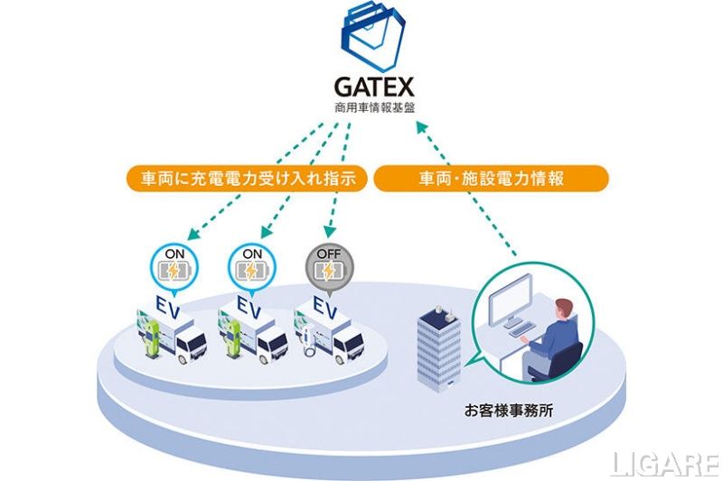 また、同サービスでは、アイ・グリッド・ソリューションズのエネルギーマネジメントプラットフォーム「R.E.A.L. New Energy Platform」が施設の電力使用量の実績・予測データを分析する。その結果は、いすゞの商用車情報基盤「GATEX」に連携され、GATEXが各車両に必要となる最適な充電量を算出し、各車両へ充電の受け入れ量を指示。これにより、各車両側で指示通りの受け入れ量で充電し、施設全体の電力ピークの超過を抑制する。また、エルフEVには通信で充電のON/OFFを制御する機能が備わっているため、充電器と車両の紐づけが不要となり、任意の駐車スペースで充電管理が可能となるという。