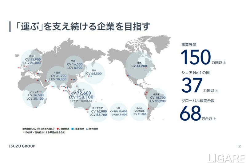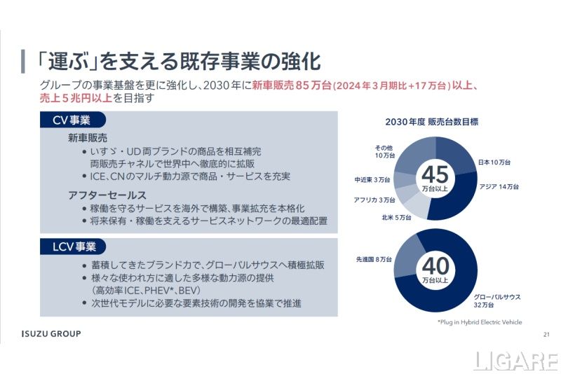 車両の販売事業はバス・トラック(CV=Commercial Vehicle)を中心に国内外で拡販し、30年度で新車販売85万台(23年度見込み約68万台)を目指す。「マルチパスウェイ」で商品とサービスを拡充し、いすゞ・UDトラックスの販売経路で展開。オンライン販売も強化する。また、海外でアフターサービス網を構築し、販売を後押しする。商品・技術の研究開発や生産拠点など既存事業の投資は30年度までに1兆6000億円を見込む。「グローバルリーディングメーカーの土台整う」