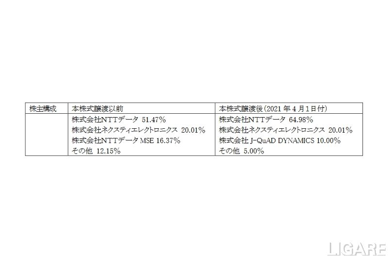 株式会社J-QuAD DYNAMICS(以下、J-QuAD)は5日付のプレスリリースで、次世代自動運転・先進安全支援領域におけるソフトウエア開発を強化するため、車両ソフトウエア開発環境技術を持つ株式会社NTTデータ オートモビリジェンス研究所(以下、ARC)に出資したことを明かした。日本電信電話株式会社のグループ会社である株式会社NTTデータMSEの保有するARC株式のうち、13,990株(10.00%)をJ-QuADに譲渡する。