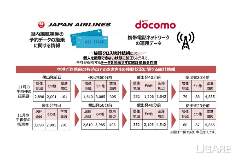 なお、同実証実験では、JALが保有する国内線航空券の予約データの搭乗に関する情報と、ドコモが保有する携帯電話ネットワークの運用データの一部(ユーザーが利用する携帯電話の位置データ、およびユーザーの属性データ)を取り扱う予定だ。