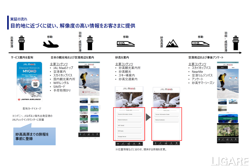 日本航空株式会社(以下、JAL)は、2月26日、新潟県妙高市(以下、妙高市)で訪日外国人向けに、公共交通機関や観光地などの情報をアプリに集約し、利用者の旅程・位置情報に合った適切なタイミングで情報提供する実証実施を発表した。