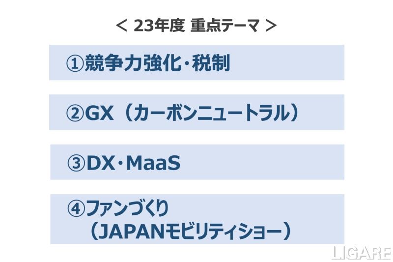 23年度の自工会の重点テーマ4点も明らかにした。各テーマの活動方針は次の通り。