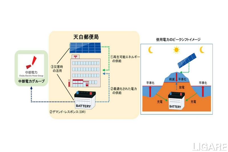 今回の取り組みは、日本郵政、日本郵便株式会社(以下、日本郵便)、および中部電力株式会社(以下、中部電力)の3社で実施する。日本郵政グループは、2050年のカーボンニュートラル化の達成に向けて、約2万4000の郵便局を活用して、2030年度までに温室効果ガスの2019年度比46%削減を目指している。同時に、地域のカーボンニュートラル化の推進にも貢献することが重要と考えているという。