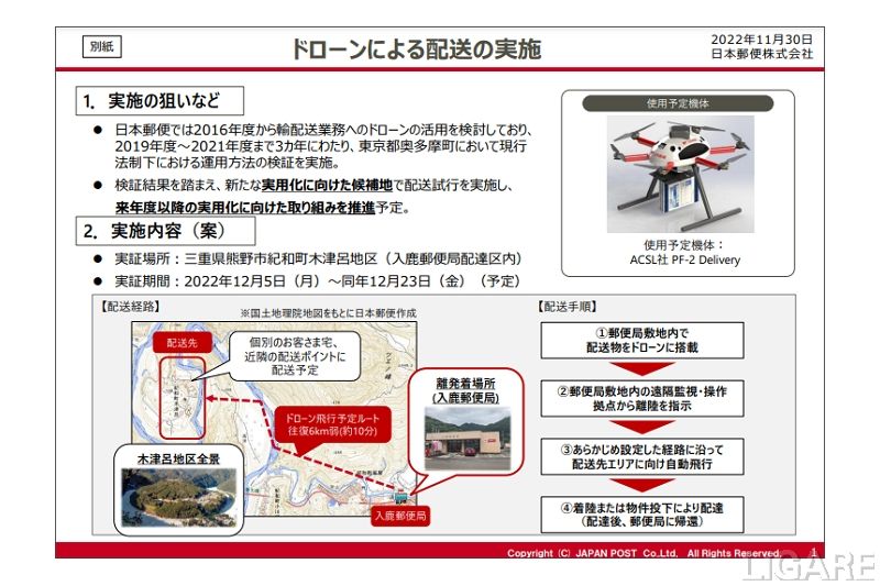 日本郵便株式会社(以下、日本郵便)は、株式会社ACSL(以下、ACSL)と三重県熊野市(以下、熊野市)の協力の下、ドローンによる郵便物などの配送を試行する。11月30日付のプレスリリースで明かした。