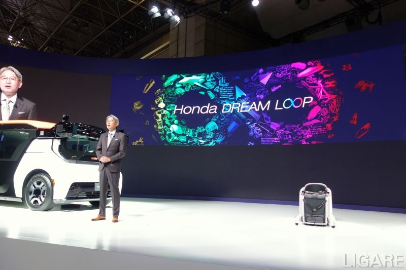 ホンダはジャパンモビリティショー2023で「Honda DREAM LOOP」をテーマに掲げ、GMクルーズと開発を進める自動運転タクシーや、資源の循環利用を意識したコンセプトカーなどを展示。さらに、交換式バッテリーを採用した小型EVや商用バンなど、多数のモビリティと関連技術の紹介を行った。