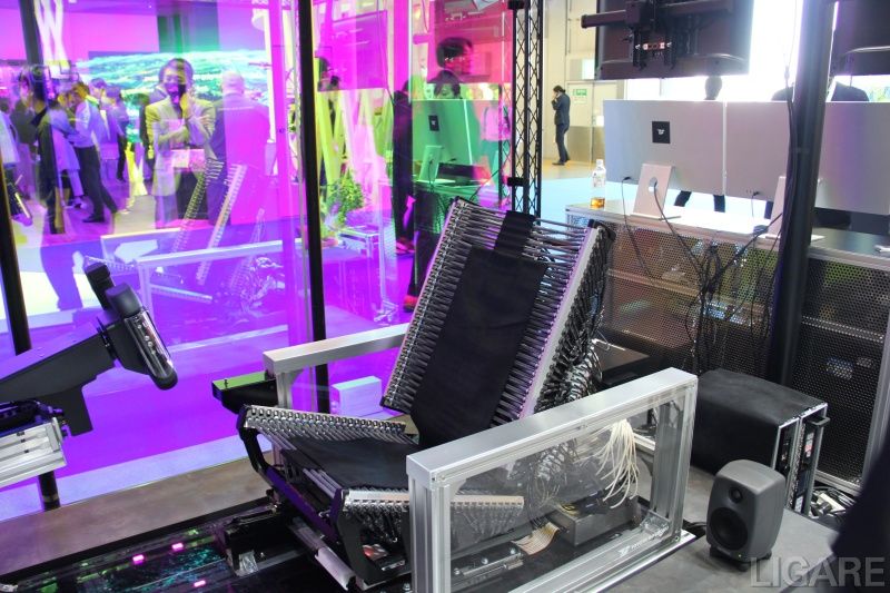 自社ブースに展示された「VODY2.0」は、人工筋肉を組み上げたシート。空気圧がかかると人工筋肉が動き、シートが伸び縮みする。座る人の体重や姿勢に応じて空気圧を調整して、最適な座り心地を図る。トヨタ紡織は研究を進め、センシング結果を製品開発に生かす考え。26年の実用化を目指す「サーマルコンフォートシート」も出展した。シートが座る人を直接温める・冷やすことで冷暖房の効率化・電力使用を抑制し、EVの電費向上につながる。