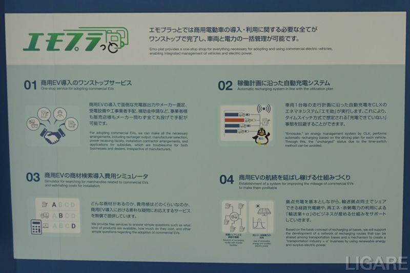 また、商用EV向けの取り組みとして、2021年に関西電力と設立したキューブリンクスについても言及。車両や設備の導入コンサルティング、充電設備の設置、稼働マネジメントシステムなど、電動車に関するソリューションを一括で提供するプラットフォーム「エモプラっと」を紹介した。