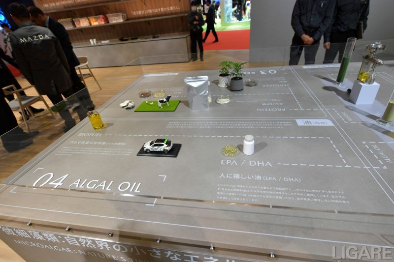 マツダが出展した燃料は、微細藻類「ナンノクロロプシス」を原料にしたバイオ燃料だ。ナンノクロロプシスは、成長する過程で大気中のCO₂を吸収する性質を持っている。走行中に排出するCO₂は、ナンノクロロプシスと相殺してカーボンニュートラルが実現する仕組み。