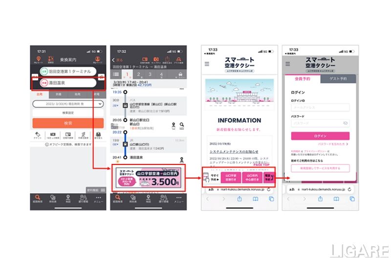 「スマート空港タクシー」は、山口宇部空港~山口市内間の直行サービスだ。「乗換案内」で「スマート空港タクシー」のサービスエリア内(山口宇部空港・山口市内)を検索したときに、検索結果画面にバナーが表⽰される。その後、「スマート空港タクシー」のWebアプリに遷移し、タクシーを予約することが可能だ。