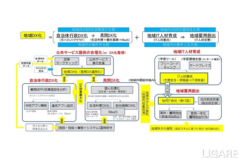 同事業の主要項目は、地域内のDX化を図る「地域内DX化」と地域内でのIT従事者を生む「地域内雇用創出」だ。地域内DX化は、公共サービス提供の合理化(政策提言から地域DX化要件)、自治体行政DX化(ガバメントクラウド※前提としたDX化)、民間DX化(定住者・交流者・関係者の利便性向上のDX化)などを想定したものだ。そして、民間DX化には、生活利便、観光振興、MaaSが含まれている。一方、「地域内雇用創出」では、地域内におけるIT人材育成や、地域内で育成したIT人材を雇用するためのIT事業に取り組んでいくという。