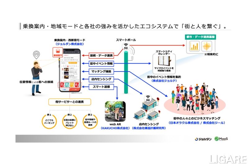 同実証実験では、位置情報を元に西新宿エリアにログインしたかのようなアプリからの入口体験を通じて、ユーザーが欲しい情報を常時入手できるようにする。将来的には、エリア利用者の趣味・趣向からパーソナライズする予定だ。さらに、移動における基本機能に加え、連携5社とのエコシステム構築と、他スタートアップ企業など各種サービスともアプリ経由で連結可能にするという。