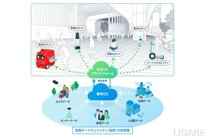 同実証は、「高輪ゲートウェイシティ(仮称)」のまちづくりをコアとして、場所や時間にとらわれない働き方・くらし方を創出する「空間自在プロジェクト」の一環だ。ビルに設置している防犯カメラなど、都市や街の設備が持つデータを収集・分析するデータ連動基盤(以下、都市OS)と、ロボットの位置情報管理や走行の制御、および設備との連携を行うロボットプラットフォームとを連携させる。これにより、これまでロボット単独ではできなかった高度なサービスの実現や、利用者の需要に柔軟に対応できる環境の構築を目指す。