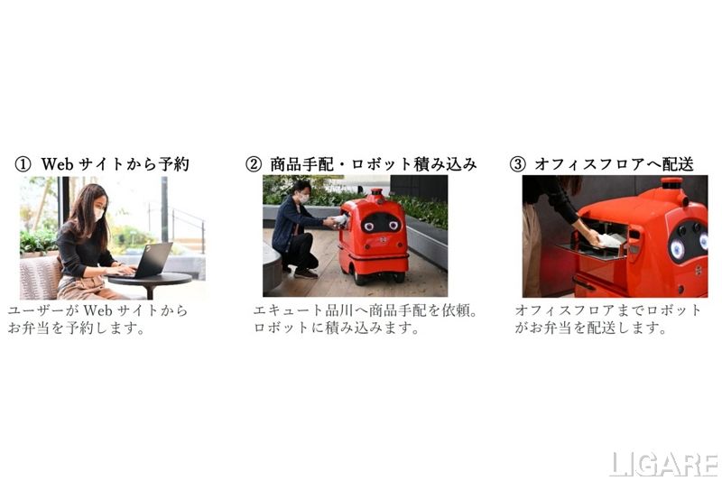 同実証では、JR目黒MARCビル内で勤務するオフィスワーカー向けに、事前に注文してもらった弁当を時間通りにオフィスフロアまで配送する。ほかにも、JR品川駅のエキナカ商業施設「エキュート品川」で販売している菓子・軽食を、ビル内(ラウンジ/ロビー/フロアなど)の人の多い場所に移動して回遊販売するサービスを試験的に提供する。