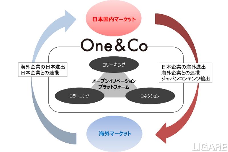 「One&Co」は、“Platform for Innovative Business”をコンセプトに、日本企業の海外進出や海外企業の日本進出をサポートする。また、スタートアップ企業と大手企業のマッチング機会や、利用者間のコミュニティ形成を促し、その出会いによりビジネス・イノベーションを創発する場となることを目指す。