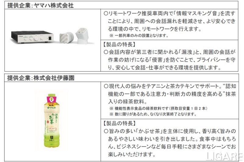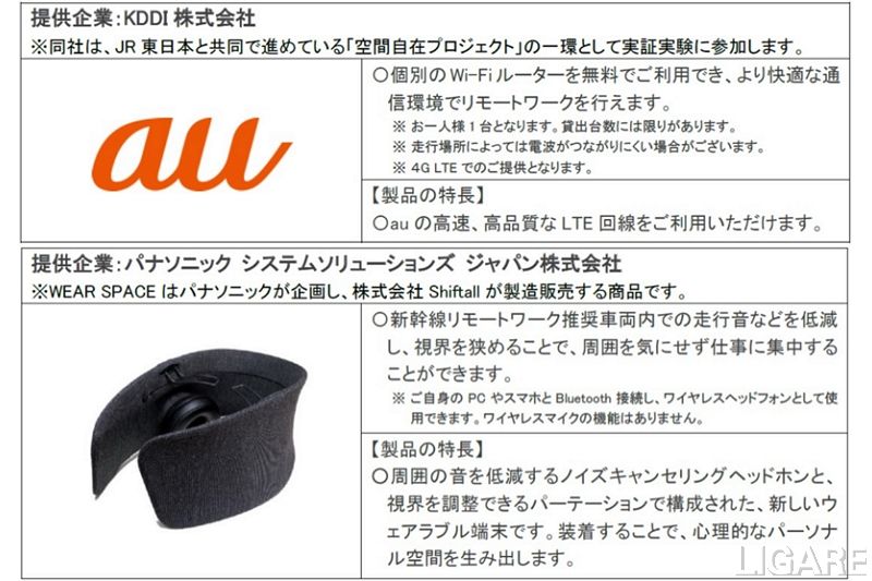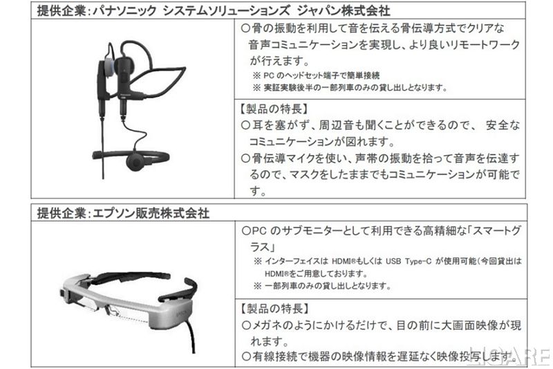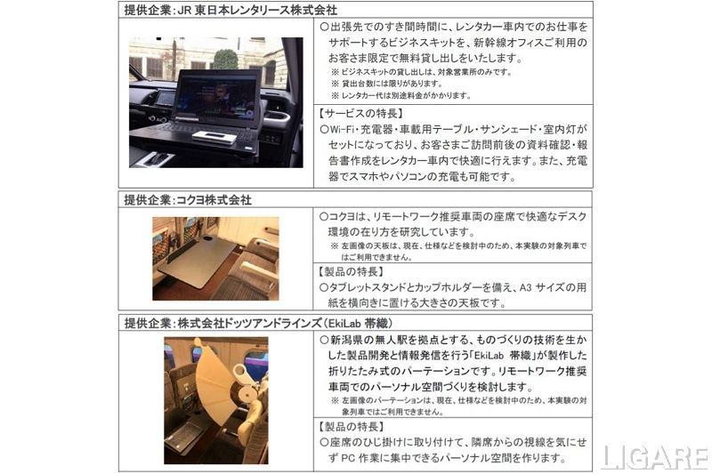 また、「リモートワーク推奨車両」では、快適で効率的なリモートワークを体験できるツールの貸し出しも行う。貸し出しを行う対象列車は、6月14日~6月30日、および7月1日~7月16日の予定だ。新幹線降車後の移動を想定したレンタカー車内で使うことのできるビジネスキットの提供、および更なる新幹線オフィスの快適性の向上を目的とした、デスク環境やパーソナル空間づくりの検討も行う。