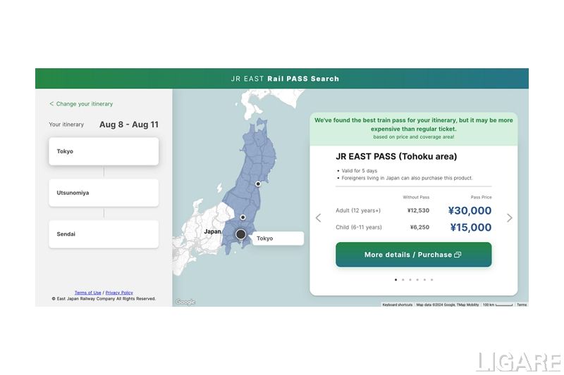 「JR EAST Rail PASS Search」は、JR東日本が8月1日に公開したパス案内サービスだ。JR東日本が販売する訪日外国人向けの鉄道パスを滞在中の移動目的や行程に合わせてスムーズに購入できる。