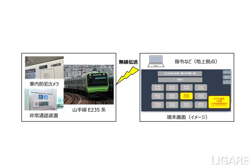また、同社は、新幹線では車内防犯カメラ映像を指令などで確認する機能(以下、地車間通信機能)を導入している(E2系、E3系の一部車両を除く)。在来線においても、2023年度末までに山手線1編成に「地車間通信機能」を試験導入し、営業列車において機能確認を行い、有用性の検証を行った上で、山手線の全編成に展開していく予定だ。