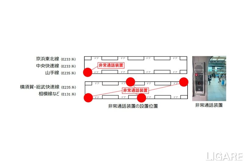 くわえて、同社は、首都圏を走行する在来線車両(普通列車)において、これまで1両あたり1カ所または2カ所の非常通話装置を設置していた。これに対し、横須賀・総武快速線E235系やE131系の新造車両から、1両あたり4カ所としているという。