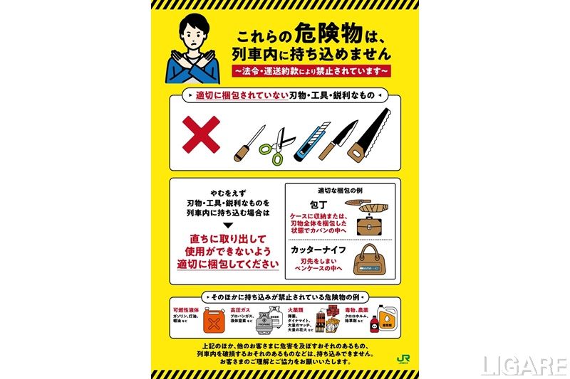 ほかにも、同社は、新幹線・在来線の全ての車両に防刃ベスト・防刃手袋・防護盾などの護身用具搭載や、警察や警備会社との協力による新幹線などの実車両を用いた異常時対応訓練を実施している。さらに、同社は、列車内への危険物持ち込み禁止を知らせるポスターを駅構内の掲示板やデジタルサイネージなどで掲出し、注意喚起を行っているという。