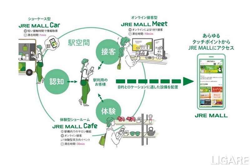 同取り組みでは、駅空間にショーケース型店舗、オンライン接客型店舗、体験型ショールーム店舗の3タイプのショールーミング拠点を導入する。ショーケース型店舗「JRE MALL Car」とオンライン接客型店舗「JRE MALL Meet」は、山手線内の駅を中心に順次展開する予定だ。体験型ショールーム「JRE MALL Cafe」は、横浜駅に開業する。