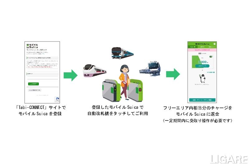 「Tabi-CONNECT」は、JR東日本が提供する地域・観光型MaaSのパッケージだ。このパッケージでは、シームレスな移動と旅の体験・価値の向上を目指している。今回のトライアルでは、「Tabi-CONNECT」のマイページでモバイルSuicaのSuicaID番号を登録することで、対象のフリーパスを購入できる。このフリーパスは、フリーエリア内の駅だけでなく、首都圏のSuica・PASMOエリアの駅であれば、どの駅からでも利用可能だ。