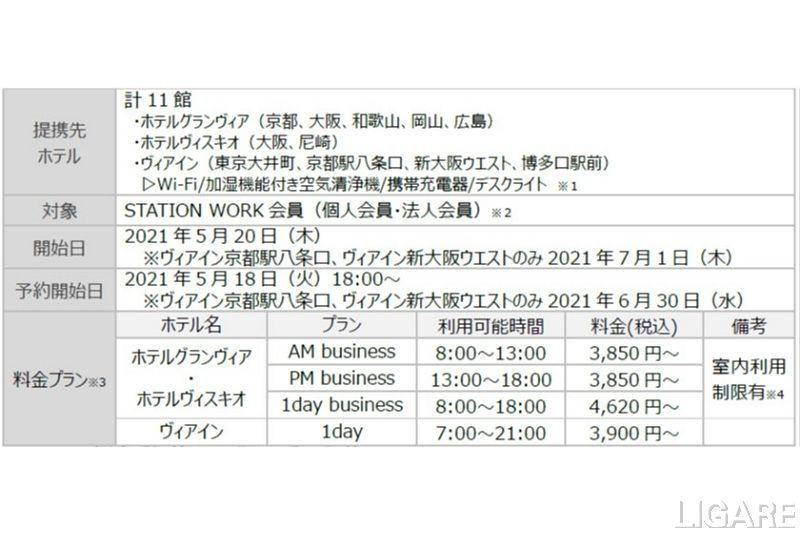 STATION WORKは、2021年5月20日より順次、株式会社ジェイアール西日本ホテル開発が展開するホテルグランヴィア・ホテルヴィスキオ、および株式会社ジェイアール西日本デイリーサービスネットが展開するヴィアインの計11館との提携を開始する。リーズナブルな価格で関西・中国エリアをはじめとしたJR西日本グループのホテルのネットワークが利用可能だ。