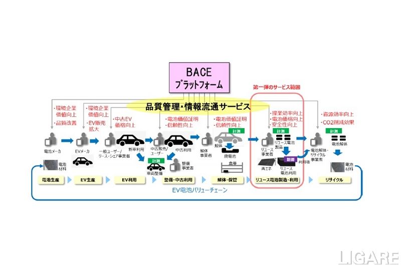 6社は、検討の第一段階として、中国広東省の電池リユース事業者と連携し、電池価値の情報管理を行って診断証明を提供するサービスの事業化を目指し、実証を開始した。同実証は、BACEプラットフォームを活用することで、電池調達時に短時間評価を行って調達する電池品質向上を行う。さらに、リユース電池製造工場の診断評価プロセスの時間を短縮して操業を効率化し、電池価値の情報管理を行って診断証明を提供する。