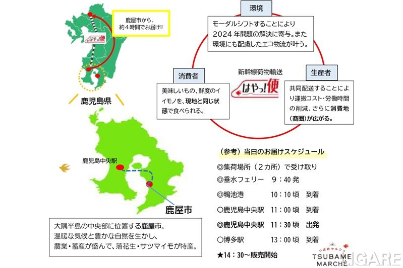 同実証は、九州新幹線や特急列車を活用した「荷物輸送サービス」と他の交通機関と新幹線を組み合わせて実施する。具体的には、鉄道の通っていない鹿児島県大隅半島(鹿屋市)~鹿児島中央駅間に共同配送便を仕立て、その後新幹線にリレー、大消費地である福岡へ即日届けるという流れだ。11月28日に実施するという。また、同実証では、積載時および販売までの所要時間、積載方法、振動状況の確認、ニーズを検証する。これにより、リードタイム短縮、共同配送によりトラックドライバー不足や CO2排出量削減、地域産品の消費拡大など地域課題の解決につなげるとのことだ。