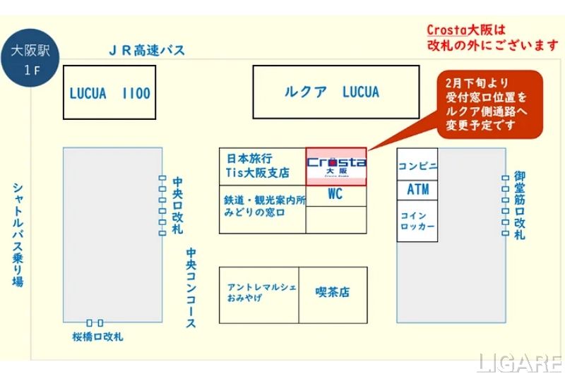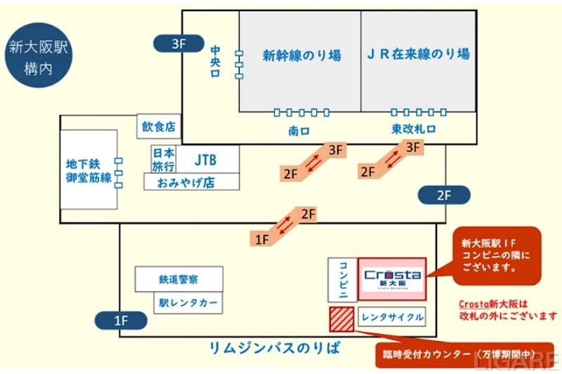 くわえて、「駅からホテルへの手荷物配送付き旅行プランの発売」では、株式会社日本旅行が、旅行専用商品「2025年大阪・関西万博へ行こう!」、「大阪・関西万博プラス1トリップ福井・和歌山・岡山へ行こう!」にて、JR新大阪駅(Crosta新大阪)から宿泊ホテルまで手荷物を配送する片道手荷物配送付プランを発売している。