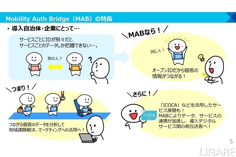 MABの特長は、「サービス間連携の促進」、「JR西日本が提供するサービス・データの利活用」、「サービス横断的なデータ利活用(構想)」だ。「サービス間連携の促進」では、MAB導入により効率的なID、アクセス管理が可能になる。1つの共通IDで各種サービスを利用できることから、MABを導入するサービス間での連携によって相互送客も期待できる。さらに、MABとは別のIDサービスと連携する機能も用意しており、さまざまなIDと各種サービスをつなぐことも可能だ。今後、マイナンバーカードとの連携も進めていくという。