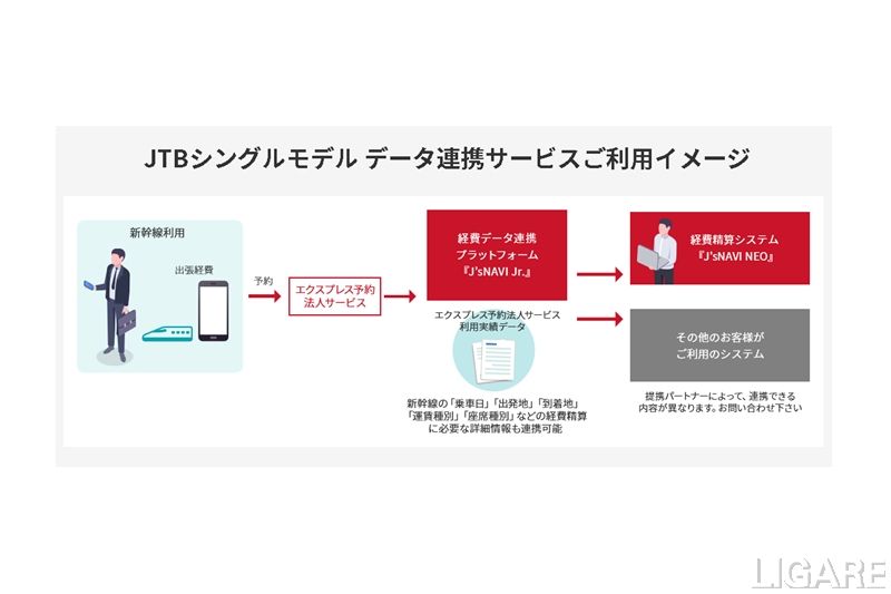 JTB-CWTは、経費データ連携プラットフォーム「J’sNAVI Jr.(ジェイズナビジュニア)」を提供している。今回提供するサービスは、エクスプレス予約法人サービスのうち、「E予約専用」かつ「直接精算方式」において、その利用実績データをJ’sNAVI Jr.経由で、ユーザーが利用するシステムや「J’sNAVI NEO」に連携する。これにより、旅費・経費精算業務の効率化を実現する。