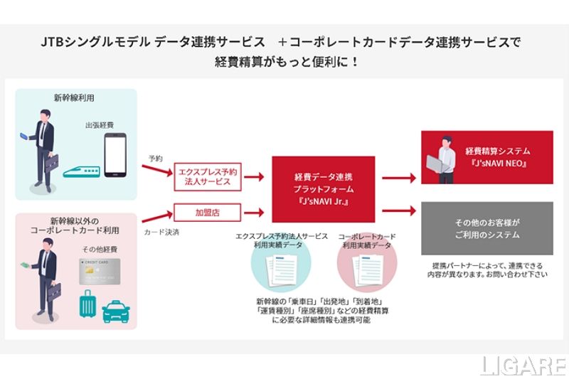 くわえて、同サービスとJ’sNAVI Jr.のコーポレートカードデータ連携サービス(11社のカード会社の利用明細データを連携可能)を一緒に利用すると、新幹線以外の経費利用データも一括で、ユーザーが利用しているシステムに連携できるという。