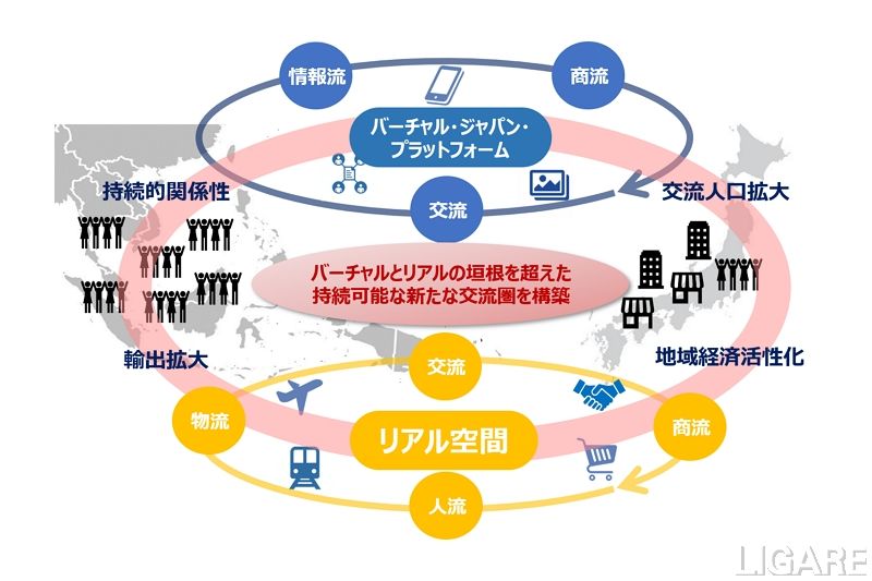 「バーチャル・ジャパン・プラットフォーム」は、仮想空間上に世界中の消費者や日本各地の自治体・事業者が集うことで新たな交流・経済圏を生み、バーチャル上で継続的に交流や商流を創出できる仕組みだ。コロナ禍で止まっている外国人旅行者によるインバウンド消費をeコマース上で回復させることを皮切りに、日本からでも楽しめるサービスを拡充し、日本と世界の架け橋となる新しい交流・経済圏を確立し、観光産業の活性化と地域経済に貢献したいと考えているという。