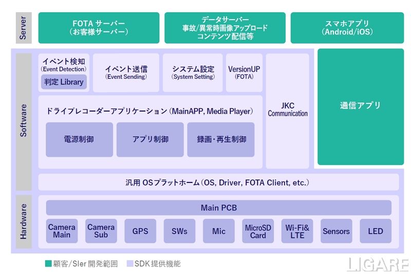 また、当社開発のSoftware Development Kit(SDK)により、フリートマネージメントシステムをはじめ、さまざまなシステムともデータを容易に連携できる。このため、短期間でのIoT・AIベースのテレマティクスサービス開発を可能とした。くわえて、LTE、およびWi-Fi/Bluetooth通信に対応するとともに、スマートフォンなどのデバイスとの接続もサポートしている。