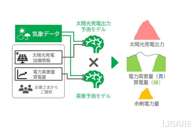 同サービスは、高圧需要家(ビルや商業施設、工場など)から低圧需要家(家庭、店舗など)まで、任意の個別需要家1地点ごとに、30分ごとの太陽光発電出力・電力需要量・買電量・余剰電力量の予測情報を提供するというものだ。利用者から事前に提供してもらう「太陽光発電設備情報」および「個別需要家ごとの電力需要量・買電量の実績値」と、日本気象協会独自の気象データをもとに予測する。日本気象協会が開発した太陽光発電出力予測モデルと需要予測モデルを組み合わせることによって、高精度な余剰電力予測を実現するという。