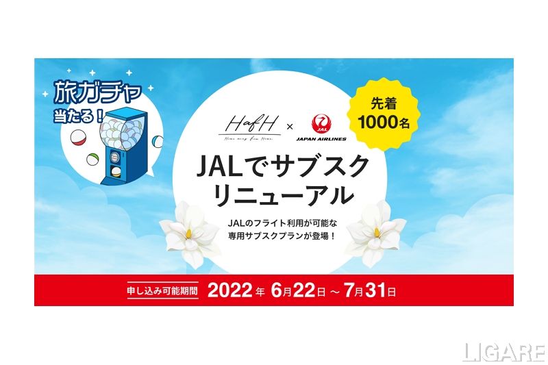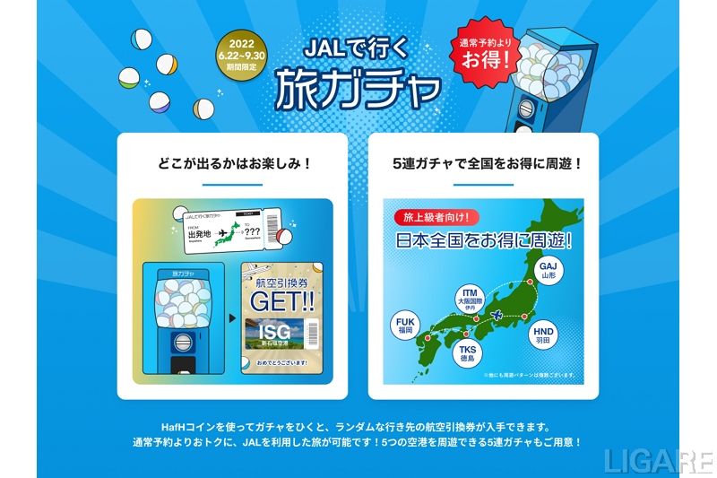 また、同実証実験参加者には、「旅ガチャチケット」を初月に付与する。このチケットを使用することで、片道航空券が1枚ゲットできるガチャをひくことができる。ガチャは、HafHコインを300コイン消費することでもひくことが可能だ。さらに、HafHコインを1200コイン消費して5枚の片道航空券が入手できる、「JALで行く5連周遊旅ガチャ」も提供する。加えて、同取り組みの一環として、2022年7月〜9月までの3カ月間、実証実験参加者限定イベント「ハフフェス」も開催している。