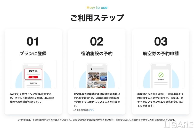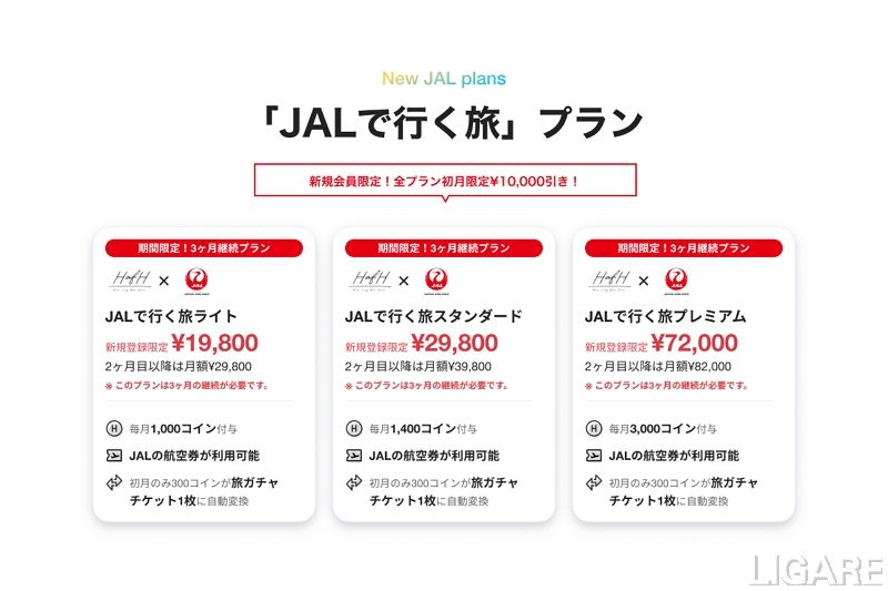 具体的には、HafH会員を対象に、同実証実験専用の3つのプラン「JALで行く旅ライト」(月額2万9800円)、「JALで行く旅スタンダード」(月額3万9800円)、「JALで行く旅プレミアム」(月額8万2000円)を提供する。同実証実験では、プランごとに付与されるHafHコインを使用して、航空券と宿泊を予約できる。なお、選択したプランは、3カ月継続する必要がある。申し込み期間は6月22日~7月31日、対象出発日は7月1日~9月30日だ。