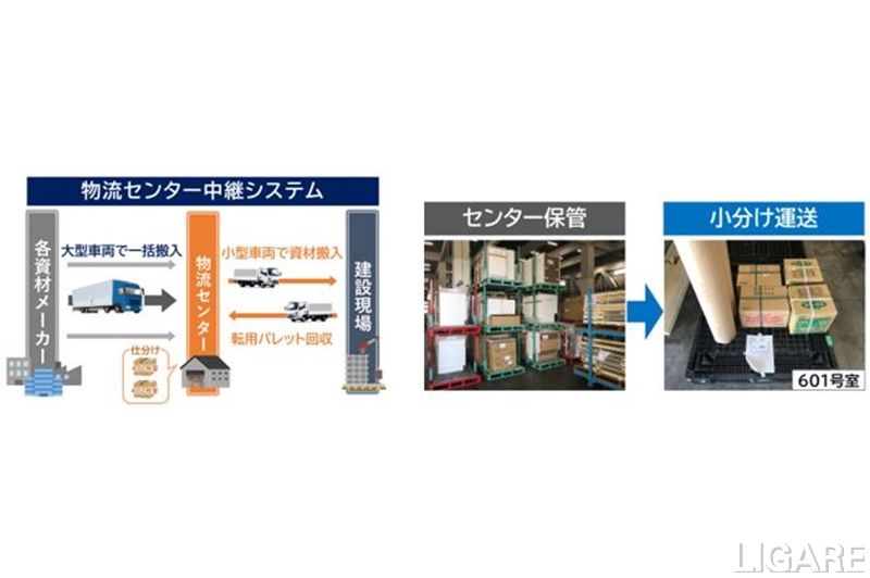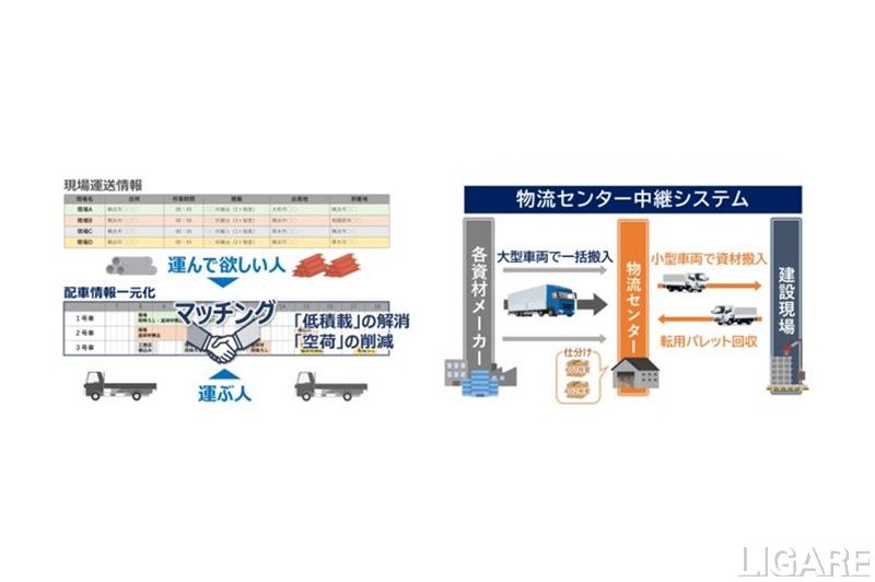 1つ目の取り組みは、ヤマトシステム開発株式会社と連携して実施する、現場で作業する協力会社と運送会社をマッチングすることで、資材の運送を効率化するアプリの開発、運用だ。もう1つの取り組みとしては、物流会社と連携し、資材を大型車両で物流センターまで運送して一時保管した後、工事のタイミングに合わせて小型車両で現場に運送する仕組みを構築、現場への導入を進めている。