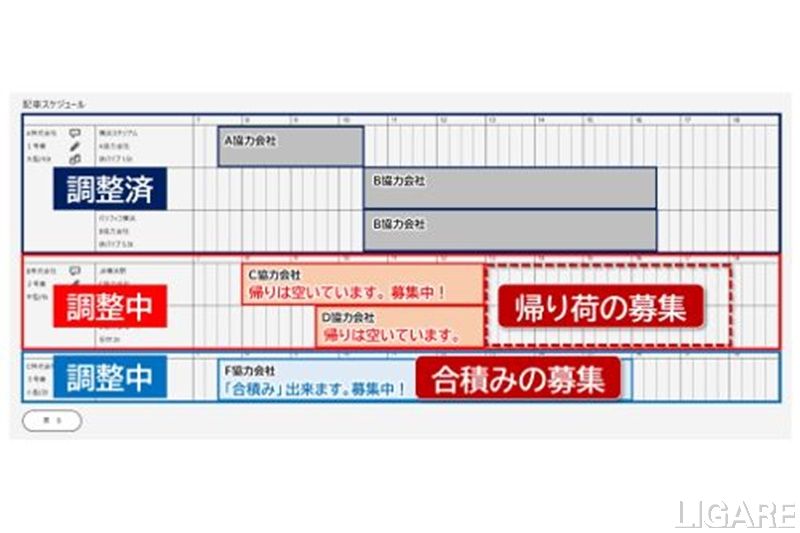 また、今回開発したアプリでは、現場で作業する協力会社が「いつ、どの資材が欲しい」と入力した情報と、運送会社が「車両サイズ、どこからどこへの運送、合積みと帰り荷の状況」を入力した情報が同じ画面で共有される。双方の情報を一元管理することで、これまでロスとなっていた部分が一目瞭然となり、無駄を無くすための諸調整を容易に行うことができる。さらに、運送後に空荷となる車両に、現場から搬出したい資材を、帰路上にある資材置場に運送するようマッチングすることで、効率をより一層高めることも可能だ。