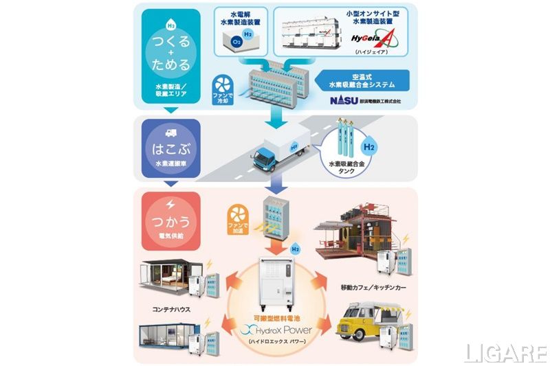 今回の取り組みは、那須電機鉄工、日本フイルコン株式会社(以下、日本フイルコン)、三菱化工機株式会社(以下、三菱化工機)の3社で実施する。水素吸蔵合金配送システムとは、製造した高純度の水素を専用のタンクに貯蔵し、電気を必要とする利用先まで運搬後、水素を再び取り出し、燃料電池を使って電力を供給・利用する一連のプロセスのことだ。水素の貯蔵や運搬が容易なことから、災害時やイベント時など、比較的小規模かつ場所や使用期間が固定されない場所での電力供給に優位点があるという。