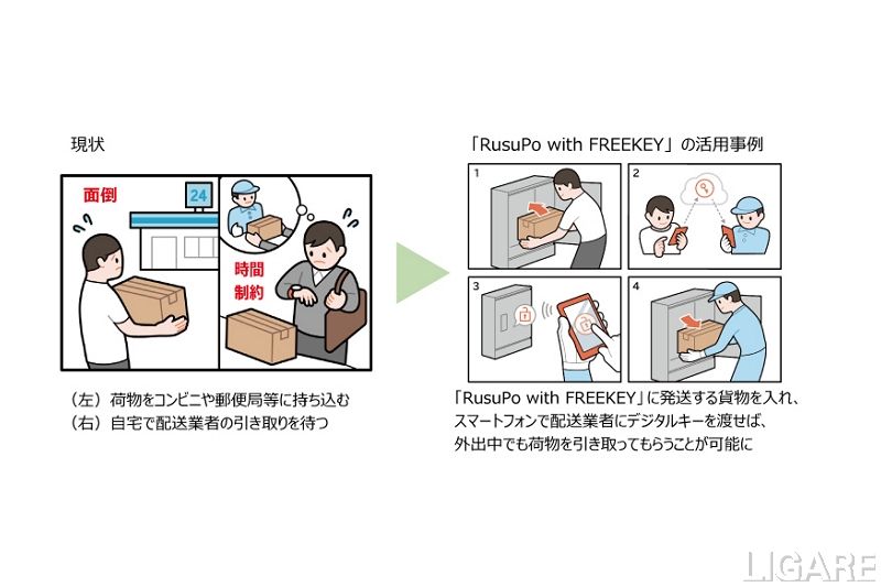 今回開発する宅配ボックス「RusuPo with FREEKEY」には、河村電器産業の宅配ボックス「RusuPo」と東海理化のデジタルキーソフトウェアを組み込んだ。これにより、東海理化のデジタルキー配信サーバーとの通信が可能となり、スマートフォンのアプリ操作による宅配ボックスの解錠/施錠が可能だ。さらに、デジタルキーを活用することにより、荷物の受け取りだけでなく、荷物の発送などのシーンにおいても利便性の向上を実現する。